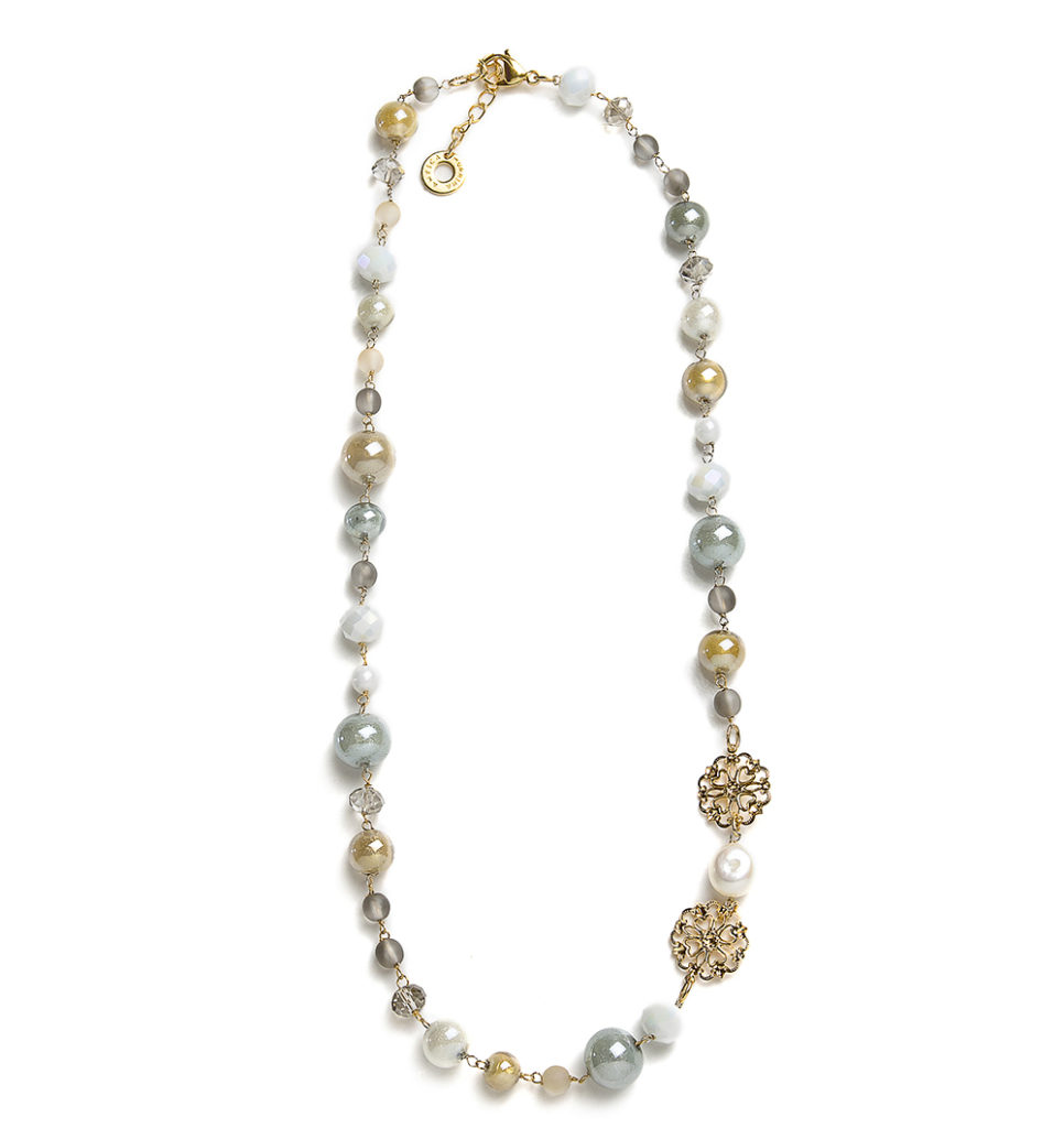Collana con perle in vetro melange, effetto opalino, minerale ed effetto lucido e satinato, nei toni del bianco, tortora e .grigio. Impreziosito da perle di fiume naturali.Componenti in metallo e acciaio galvanizzati in oro.