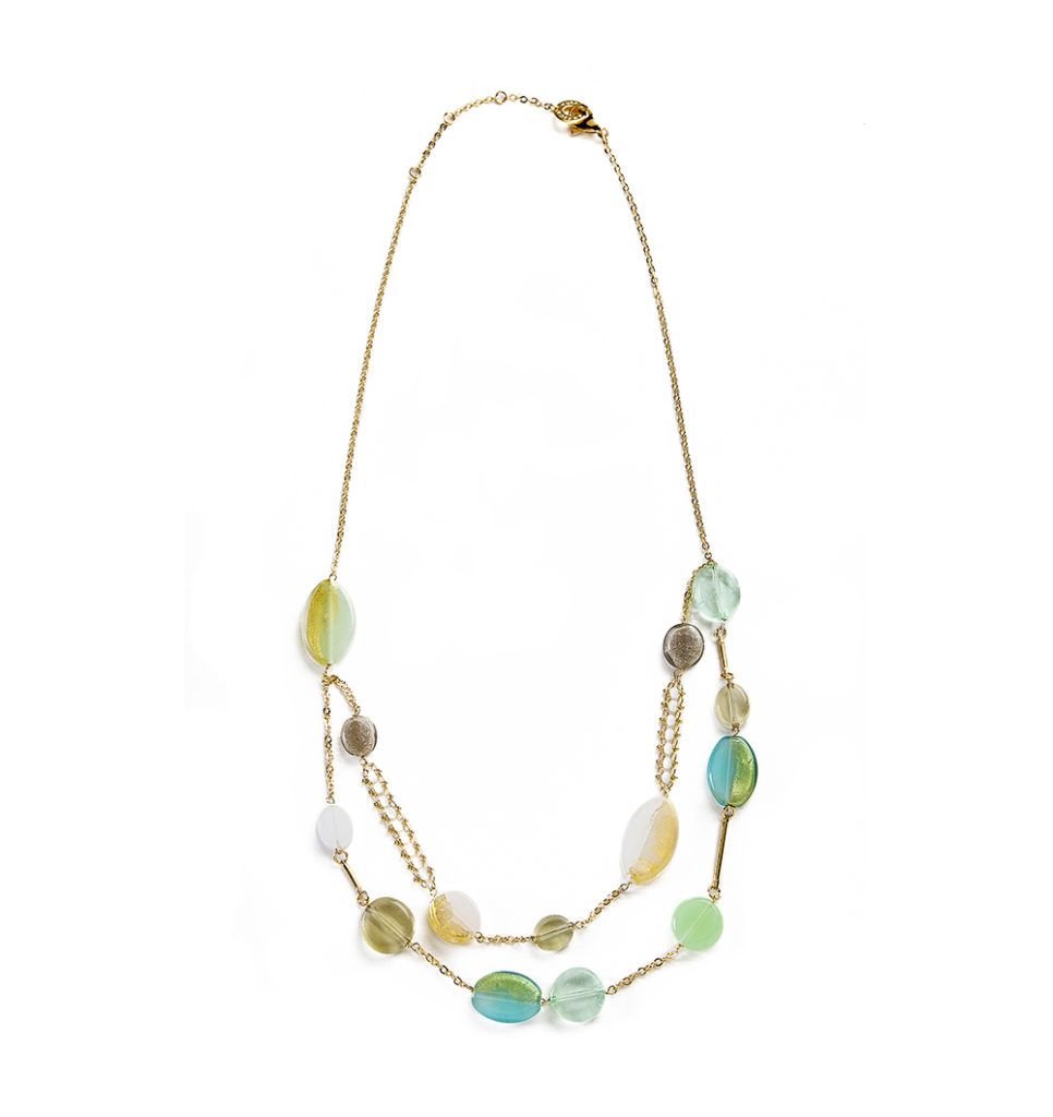 Collana con perle in vetro trasparenti effetto opalino impreziosite dalla foglia d’oro, toni dell’azzurro-verde. Componenti in metallo e acciaio galvanizzati in oro.