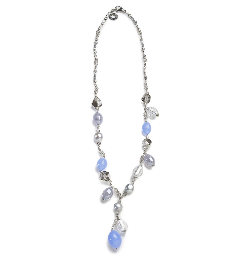 Collana con perle in vetro pastello,effetto opaline, trasparenti nelle nuance dell’azzurro-grigio con foglia argento.Impreziosito da perle di fiume .Componenti in lega di metallo galvanizzato rodio, acciaio inox .