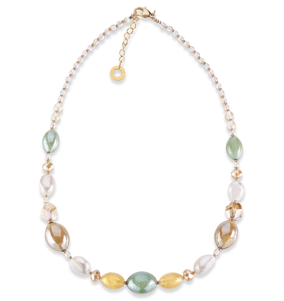 Collana con perle in vetro pastello,effetto opaline, trasparenti e con in minerale brillante nelle nuance del verde/oro, impreziosito da perle di fiume naturali .Componenti in metallo e acciaio galvanizzati.