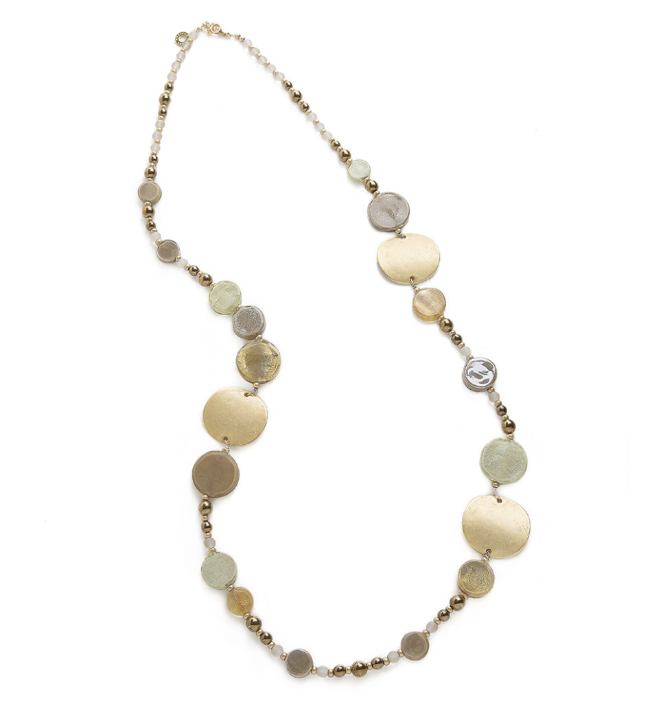 Collana con perle in vetro pastello effetto satinato,minerali, con foglia oro ,stratificate nelle nuance calde del tortora – oro, con tocchi verdi. Componenti in metallo e acciaio galvanizzati in oro .