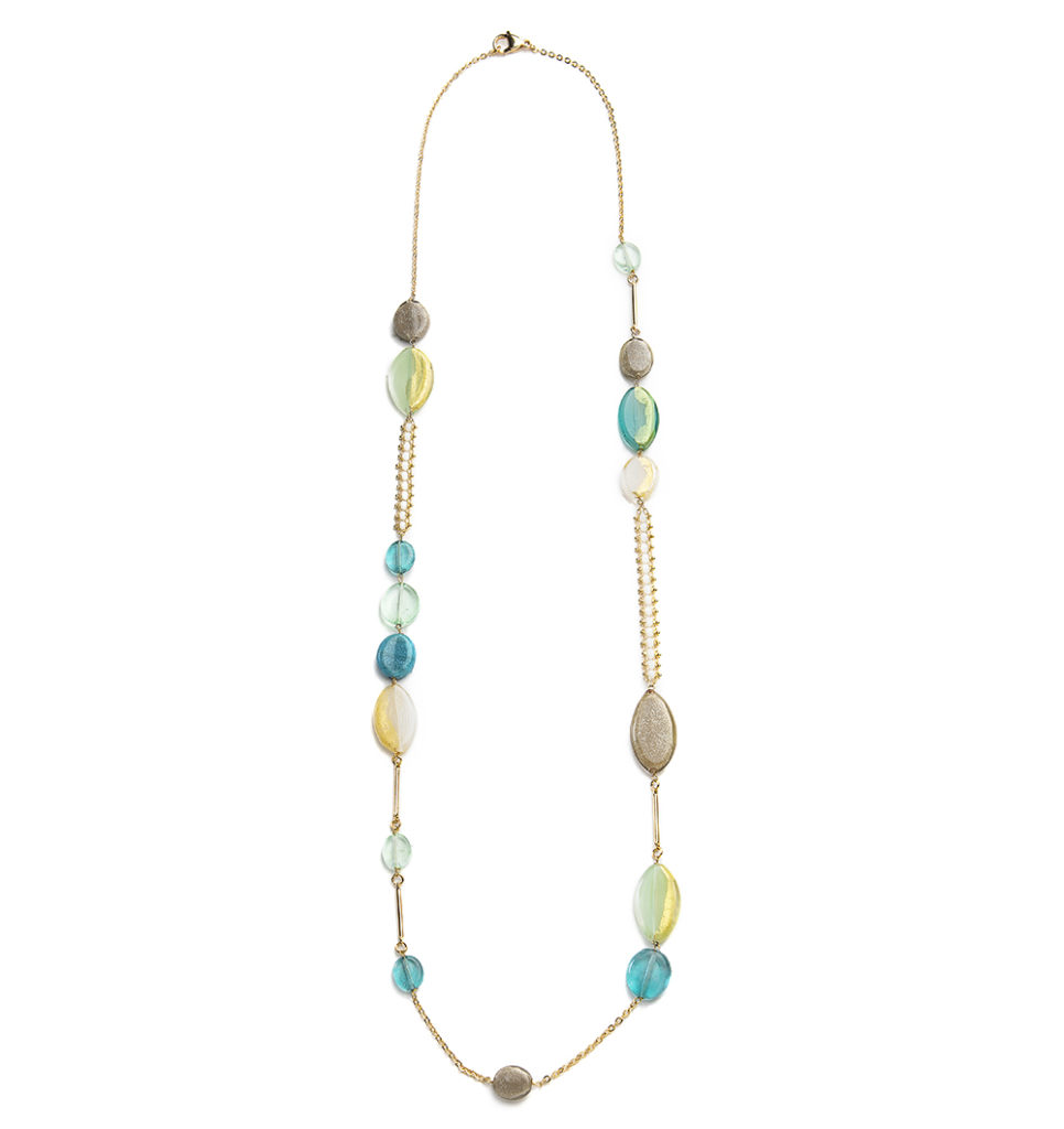 Collana con perle in vetro trasparenti effetto opalino, trasparenti impreziositi da foglia oro nei toni dell’azzurro e verde.  Componenti in metallo e acciaio galvanizzati in oro.