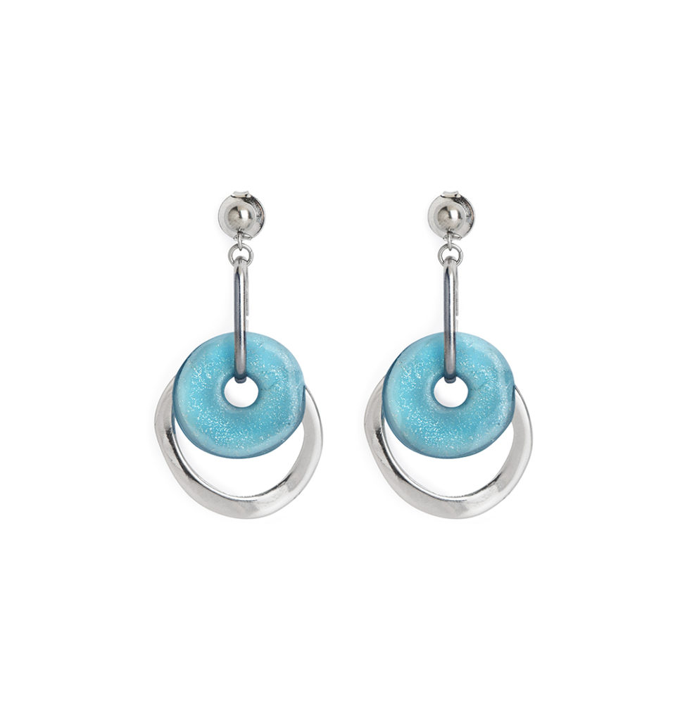 Orecchini con perle a forma di disco forato in vetro pastello e minerali con effetto lucido nelle nuance dell’azzurro-argento. Componenti in lega di metallo galvanizzato rodio, acciaio inox.