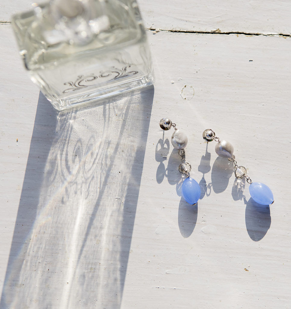 Orecchini con perle in vetro effetto opaline nelle nuance dell’azzurro-grigio. Impreziosito da perle di fiume naturali . Componenti in acciaio inox .