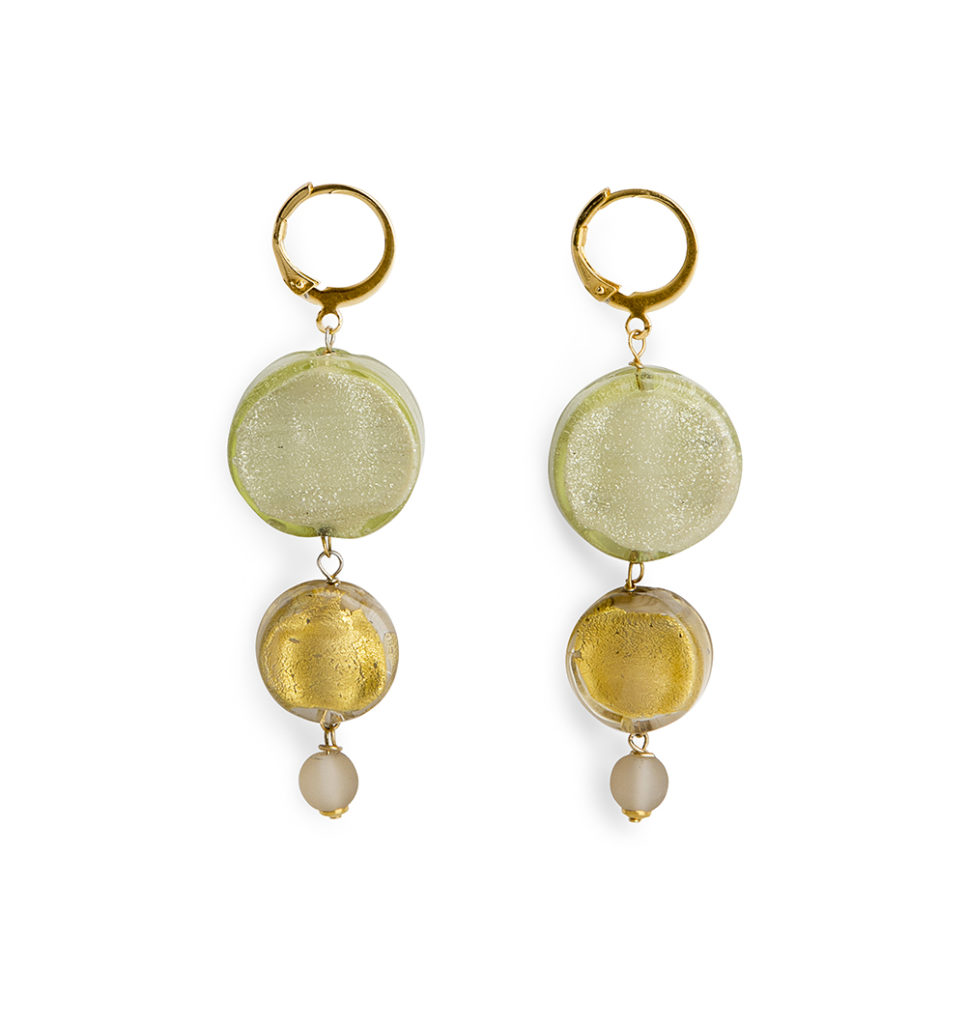 Orecchino con perle in vetro minerali, con foglia oro ,stratificate nelle nuance calde del tortora – oro, con tocchi verdi. Componenti in metallo e acciaio galvanizzati in oro.