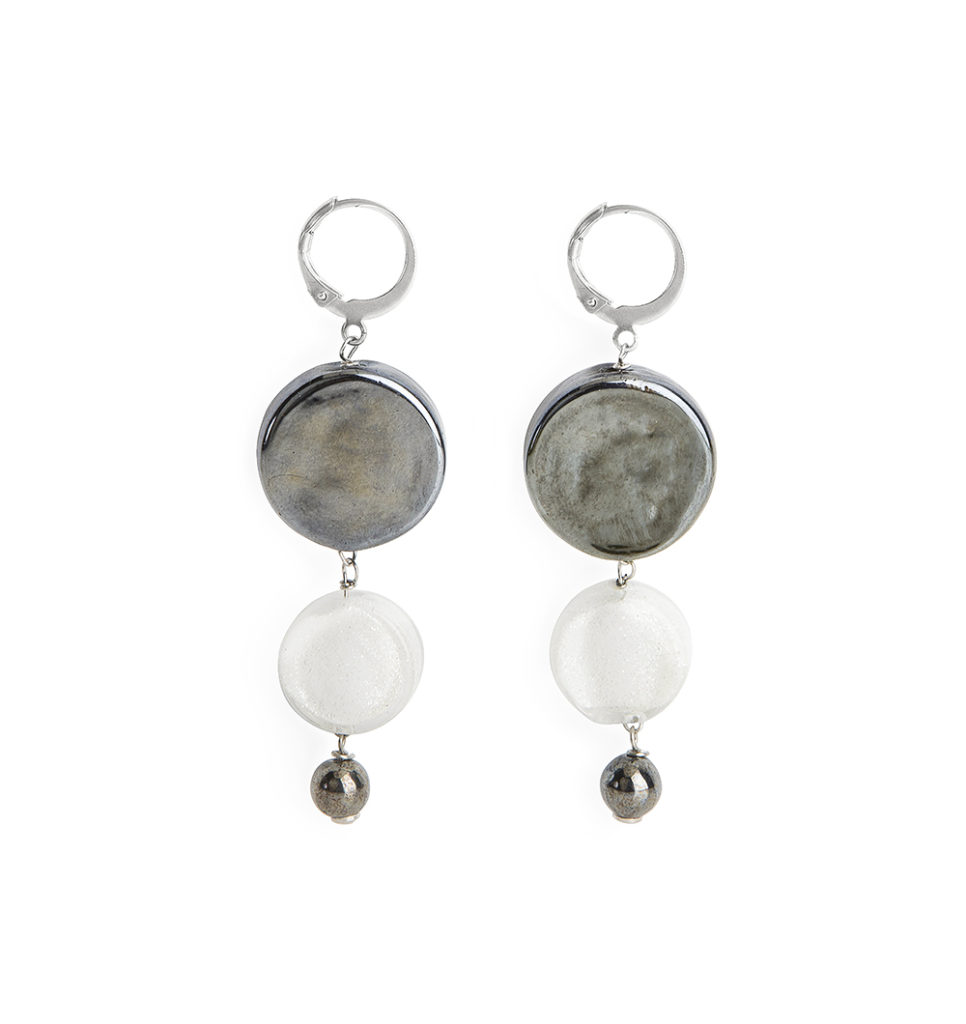 Orecchini con perle in vetro pastello effetto lucido, minerali. stratificate dai colori del bianco e nero. Componenti in lega di metallo galvanizzato rodio, acciaio inox.